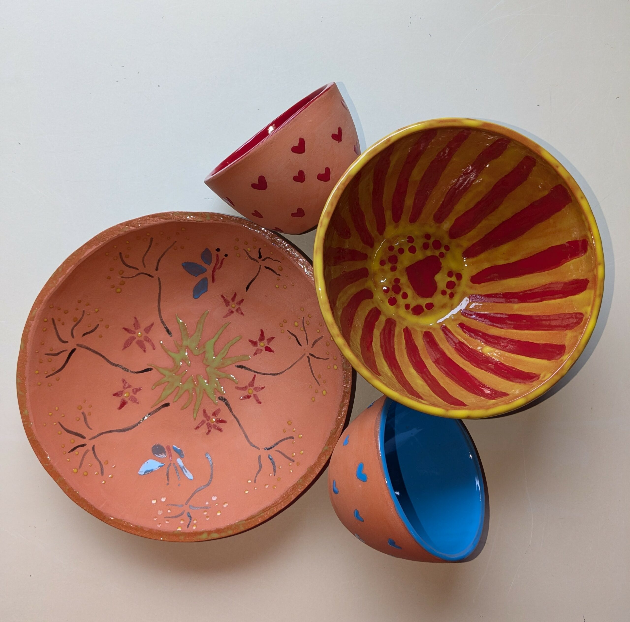 J’utilise de la porcelaine qui fait bien ressortir les couleurs des émaux. Les pièces sont cuites une première fois puis émaillées et remises au four pour la 2ème cuisson. Lors du refroidissement, le four est maintenu une dizaine d’heures entre 1000 et 1100 C° afin de permettre à l’émail de former des cristaux. Mes émaux sont alimentaires et résistent au four micro-ondes et au lave-vaisselle.